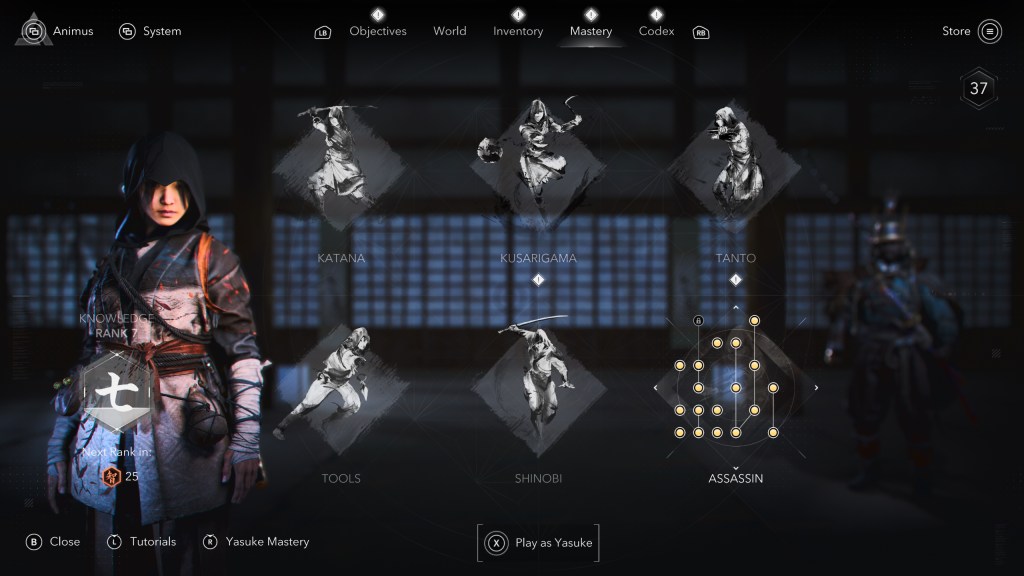 Another part of the RPG mechanics is the Mastery system. These are different skill trees you can use depending on the play style you are going for. Naoe, for example, has six different skill trees ranging from “Assassin,” to “ Tanto,” “Tools,” “Katana,” and more. I initially concentrated a lot on the Assassin skill tree so I could unlock abilities such as Eagle Vision, using my hidden blade, being able to double assassinate targets, and more. Tools are also an important one since that can unlock different items to use throughout your journey, such as smoke bombs, kunai (throwing dagger), and more. It is completely your decision how you want to do this and what you want to prioritize. Yasuke has a similar setup as well, although he has skill trees that pertain to being a samurai, not an assassin. These skill trees also tie into world exploration since you will need to increase your knowledge rank to get some of the more desirable unlocks. For example, Knowledge Rank 1 features the ability to unlock the Hidden Blade but if you want to unlock “Reinforced Blade” which will allow you to assassinate larger enemies, you will need to be at Knowledge Rank 3. You can raise your rank by exploring the world and earning Knowledge Points. Outside of missions, this is usually achieved by visiting temples and praying to certain altars or finding lost pages. There are also times when Yasuke will learn new combat moves or when Naoe finds different locations to reflect on her past, which will also earn you knowledge points. Then within some missions you can earn points as well by completing an objective. All of these systems tie in really well together to give you the complete package in Assassin’s Creed Shadows.